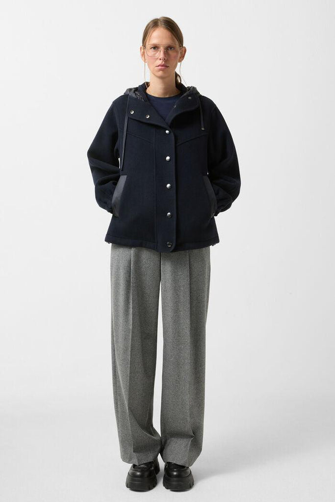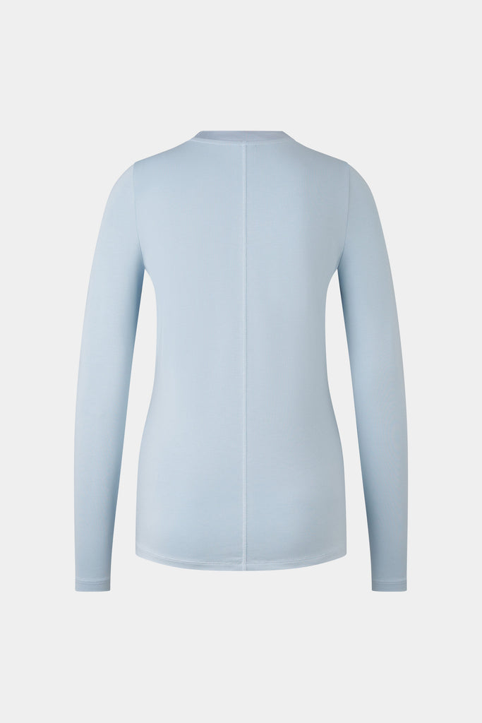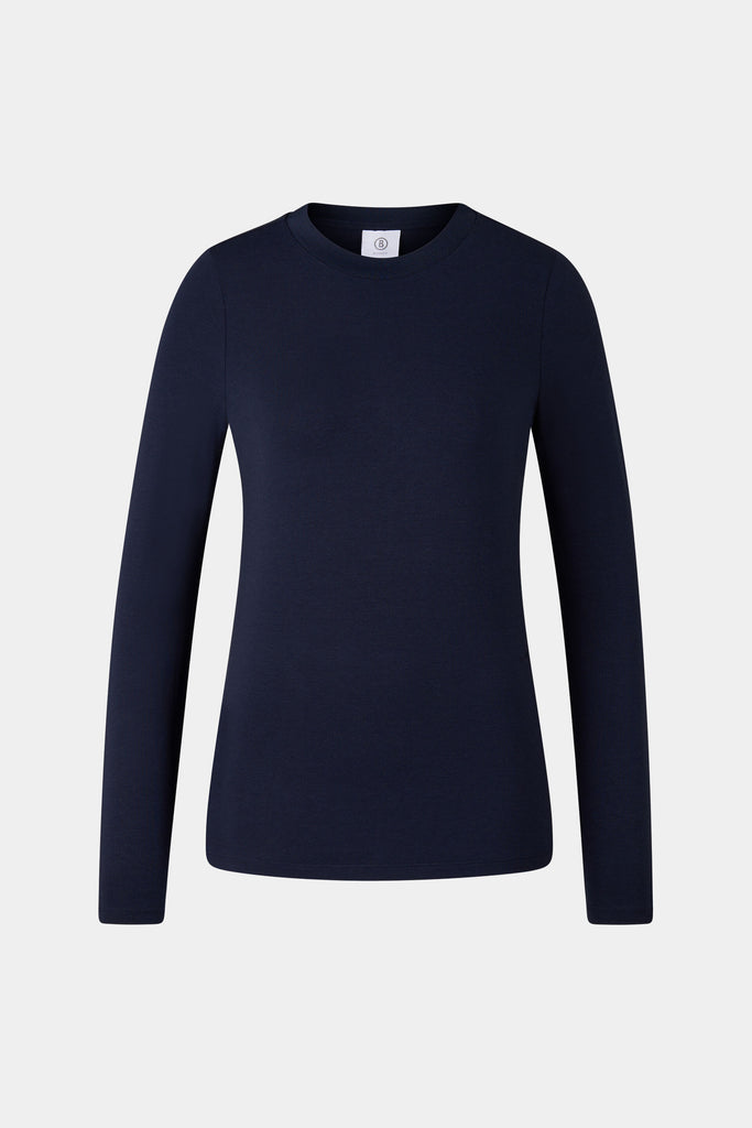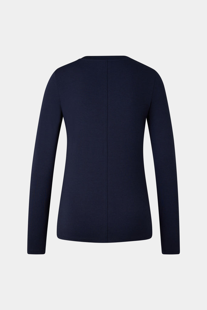 A cotton-modal mix with a silky finish characterises the stylish flair of the Alexi-1 long sleeve, complemented by the feminine round neckline with a finely ribbed look. An overlock seam on the back and the monochrome logo stitching provide accents. Navy Top shown with Mariet-D Jacket.