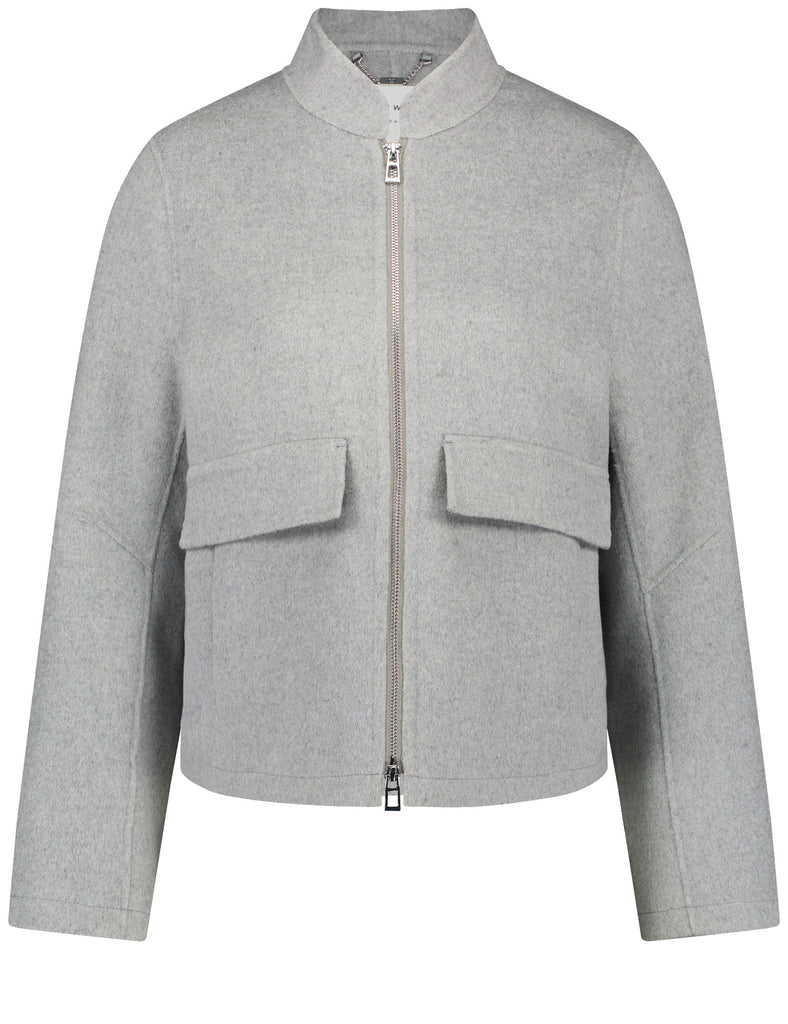 Double-face wool-blend zippered jacket. Available in Winter White and Grey