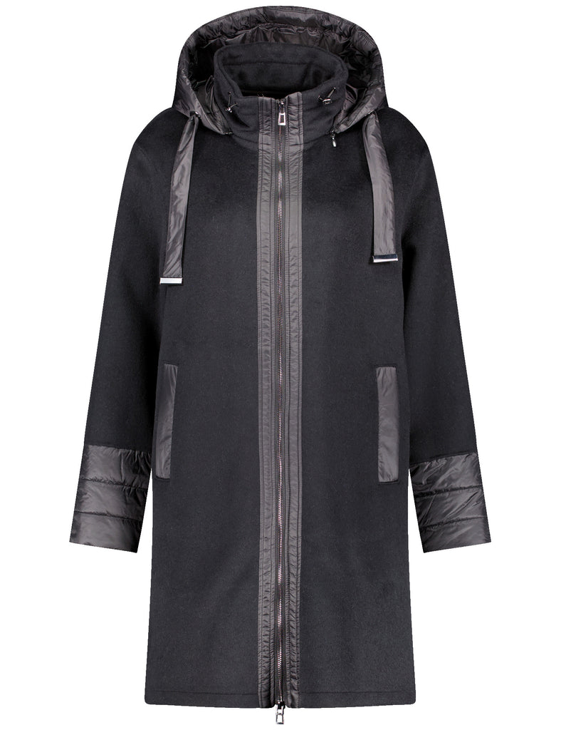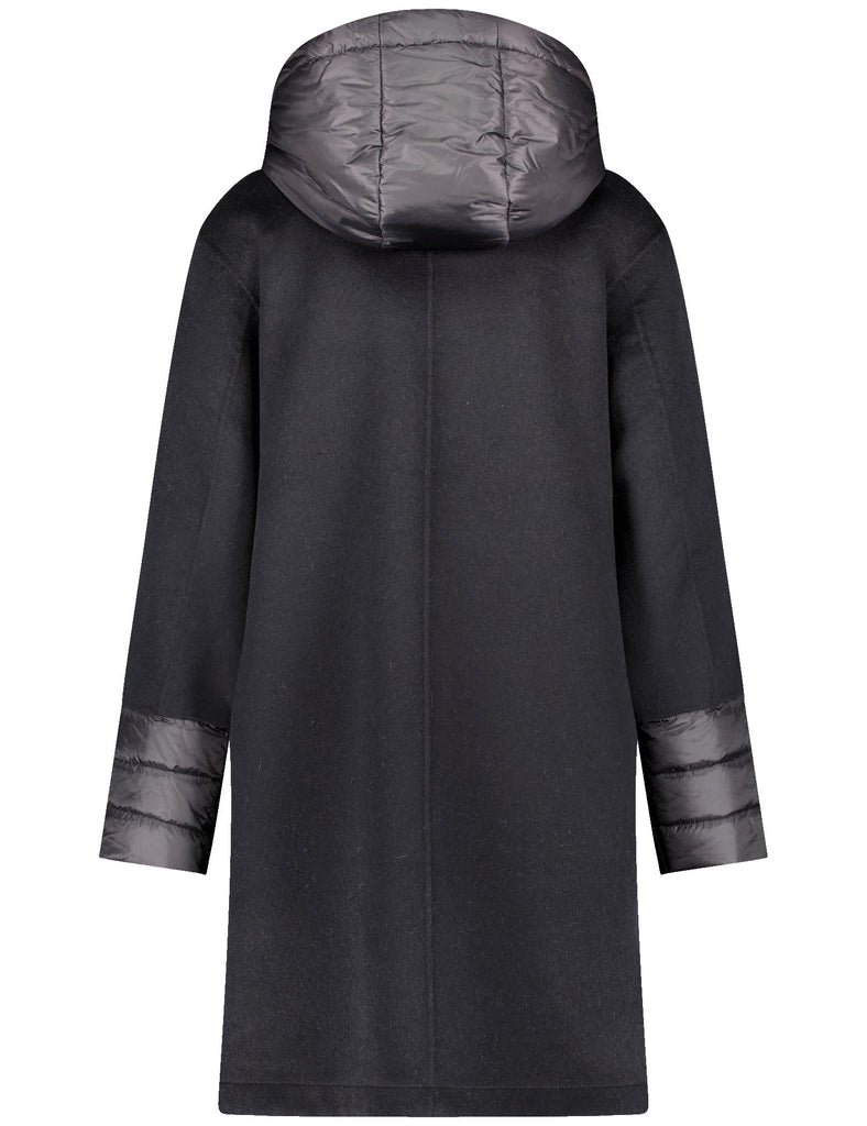 Wool-blend coat with detachable hood and contrasting quilted microfibre fabric details.
