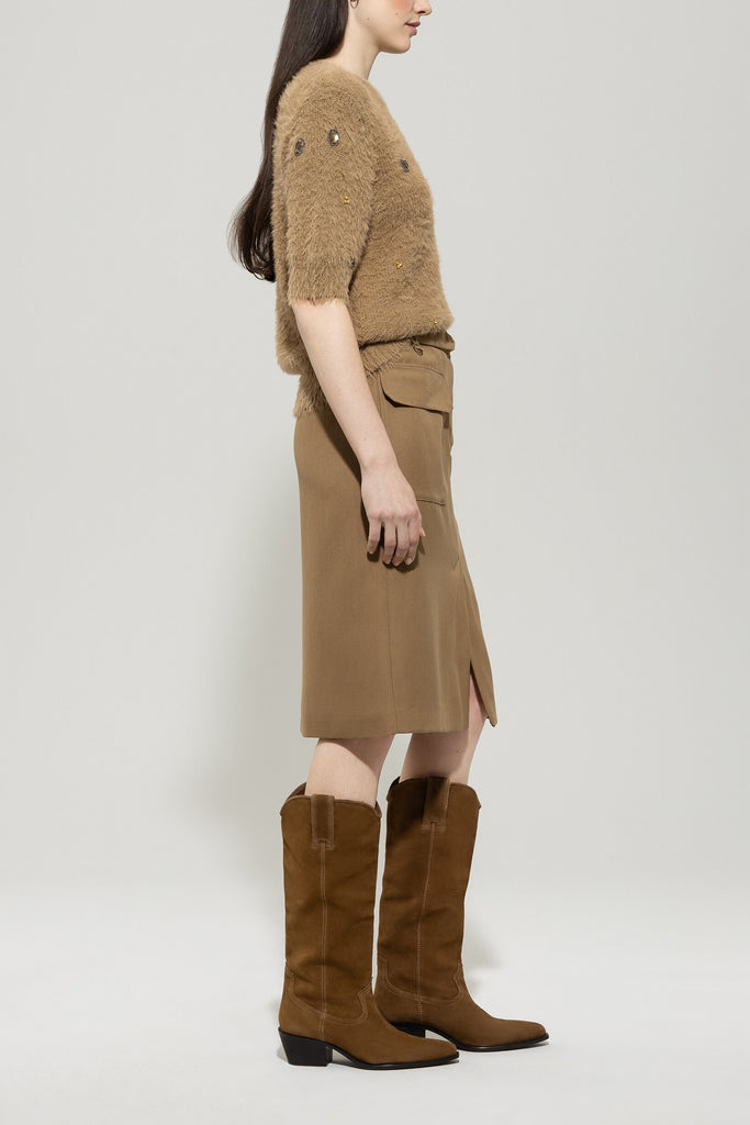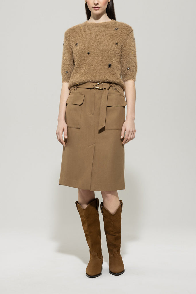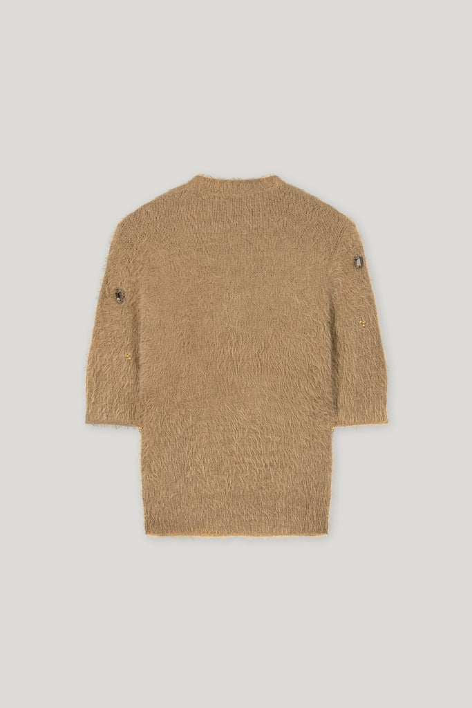 Short-sleeve gemstone pullover.  Available in Navy (shown with Denim Skirt with Ribbon Tie) and Walnut.