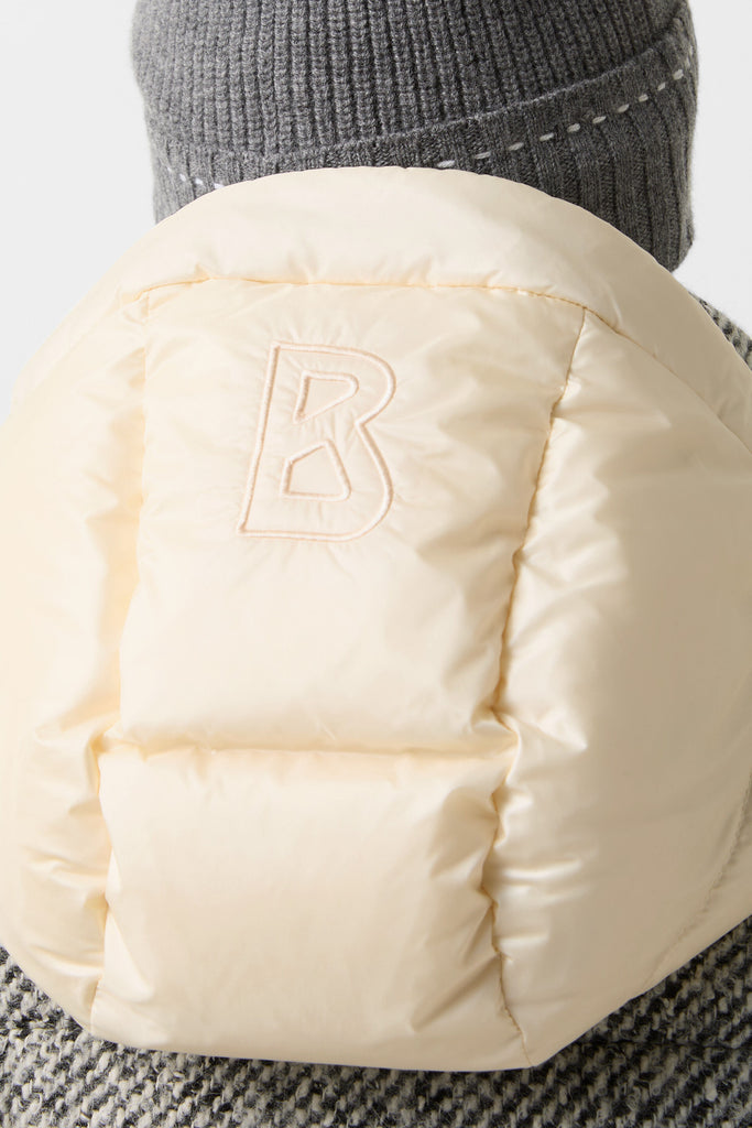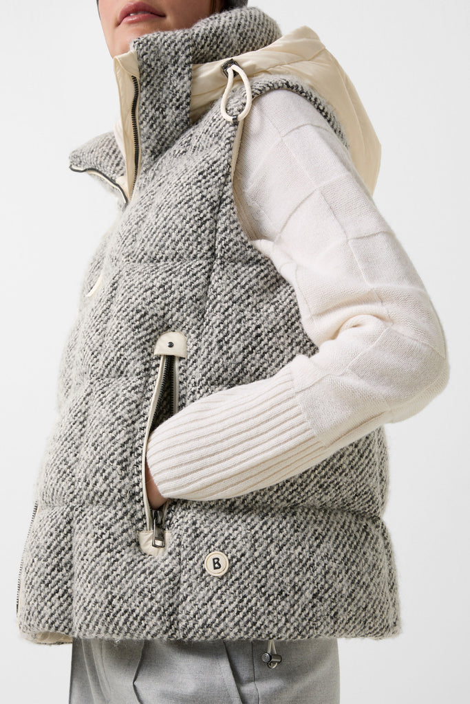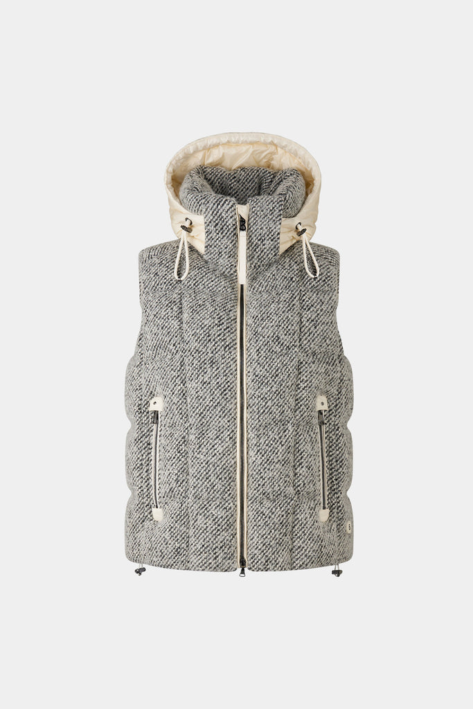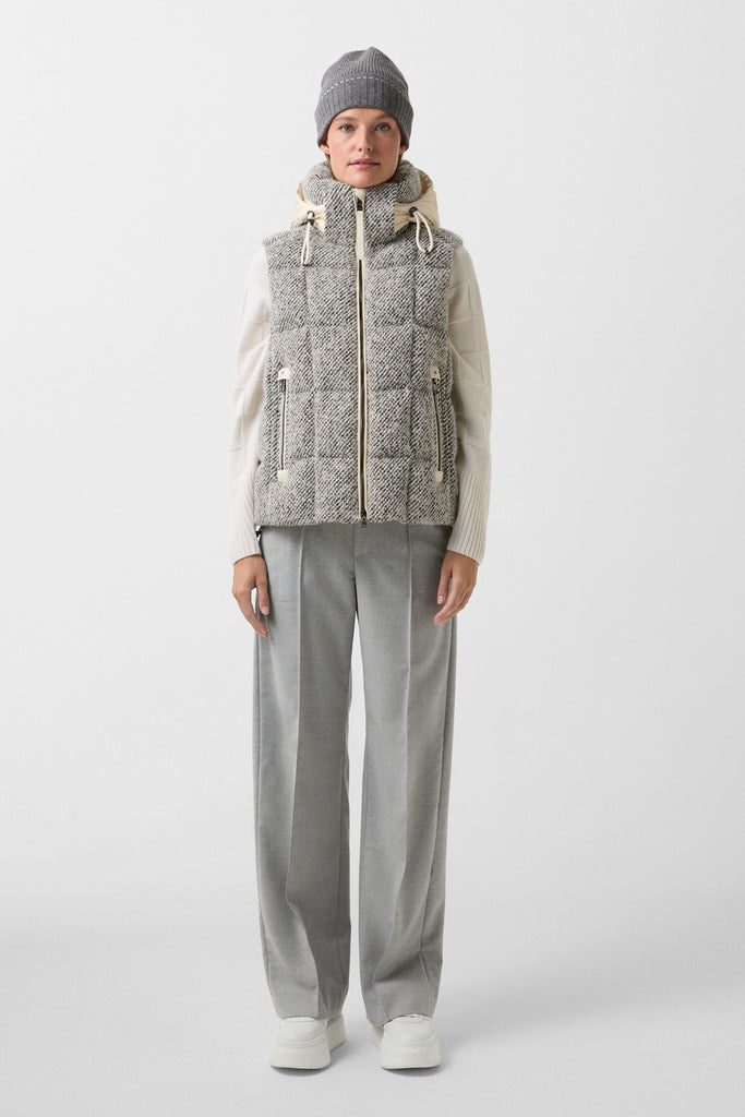The Falka-D1 down vest is characterized by its high-quality blend of virgin wool with alpaca and silk, while the pure duck down filling provides warmth. A detachable drawstring hood and a two-way zipper complete the piece, while modern label details add a stylish touch to this jacket.