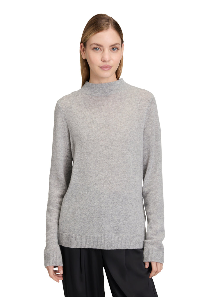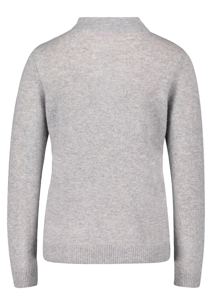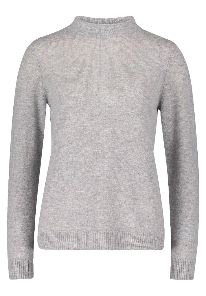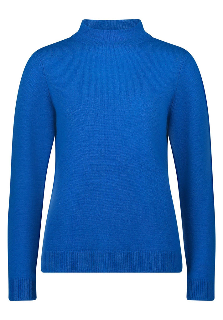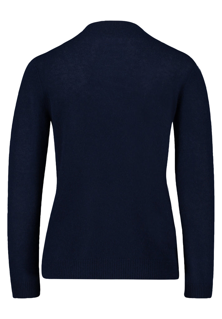 100% cashmere knit with funnel-neck and ribbed at cuffs and bottom of knit. Available in Cobalt Blue, Navy, Grey and Red